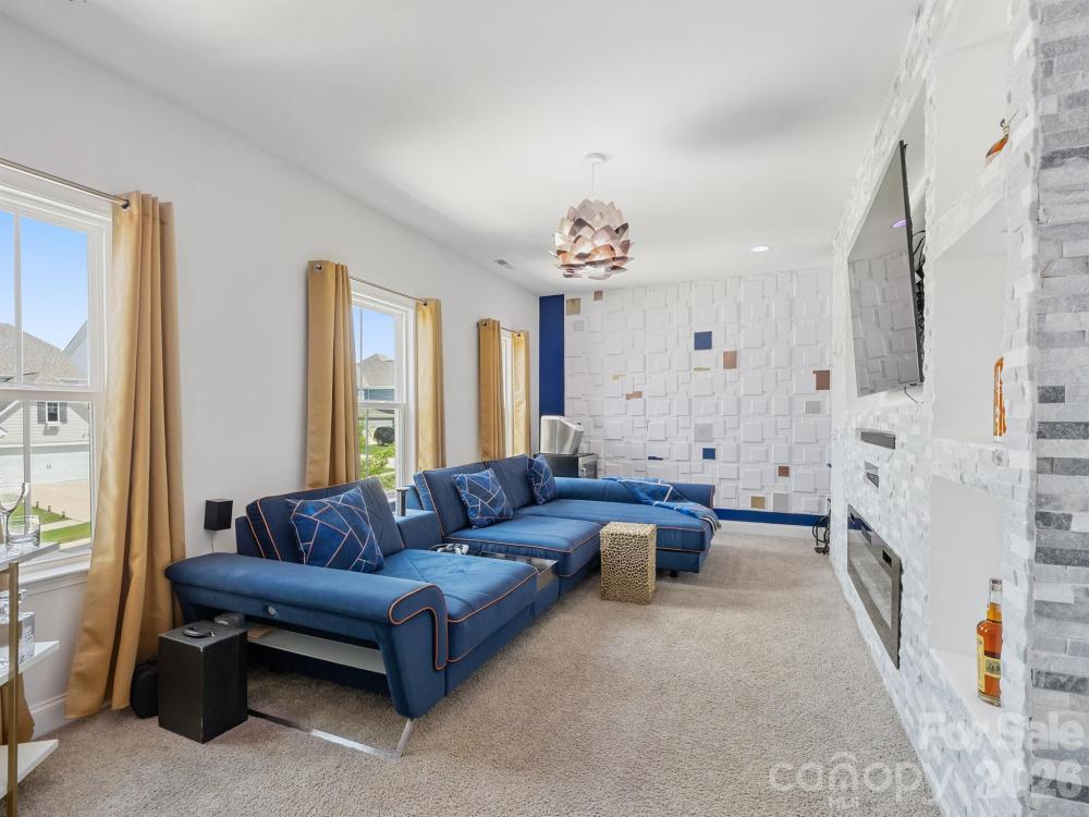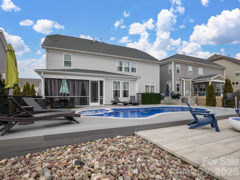 Stunning, model-style home with a heated saltwater In-ground pool and built-in Jacuzzi. Spacious patio featuring an outdoor kitchen and fire pit—perfect for entertaining year-round. Enjoy the screened porch with ceiling fan and a fully irrigated yard for easy maintenance. Permanent track lighting on the exterior of the home that you can control year round via an app. Inside, you'll find a home office off the foyer with French Doors, a large dining room with built-in cabinets and serving countertop. Open floor plan with a gourmet kitchen including a large island, wall oven, convection microwave, and gas cooktop. A guest bedroom and full bath are on the main floor, while upstairs offers a versatile loft. Custom shelves and wall accent the bonus room. A luxurious primary suite with garden tub, dual vanities, walk-in shower, and large closet. Nestled just minutes from Lake Wylie for all your favorite water activities. This meticulously maintained home is truly move-in ready! Part of the Palisades Community, so you can join for a fee to be a part of the Country Club and Golf Course.