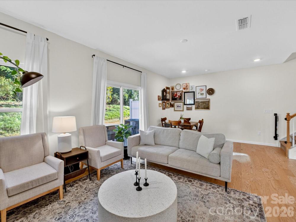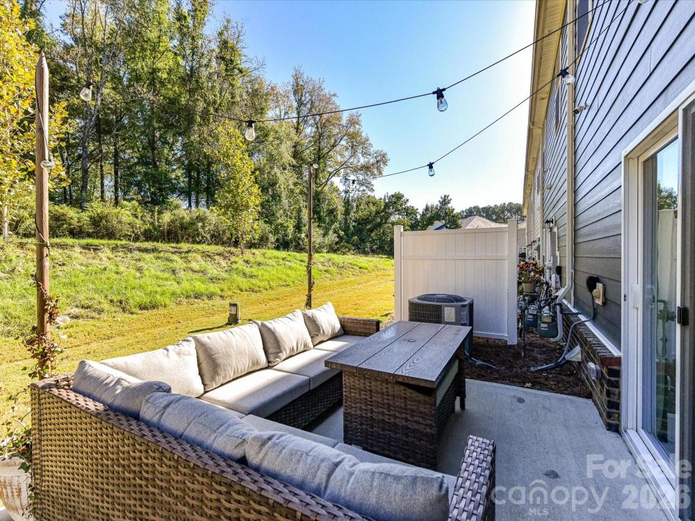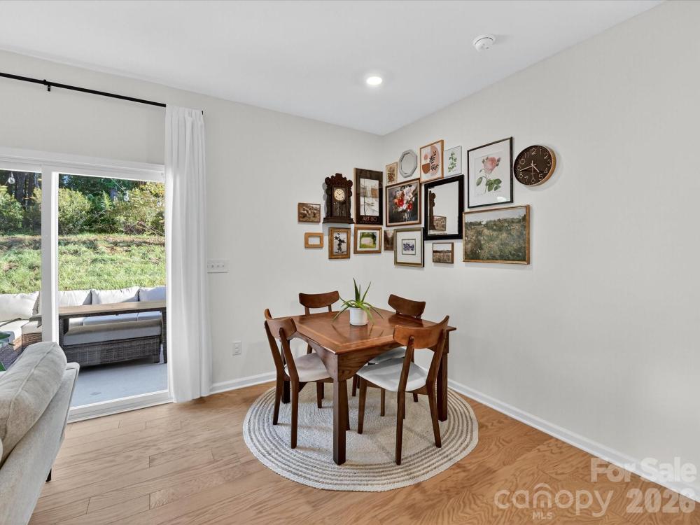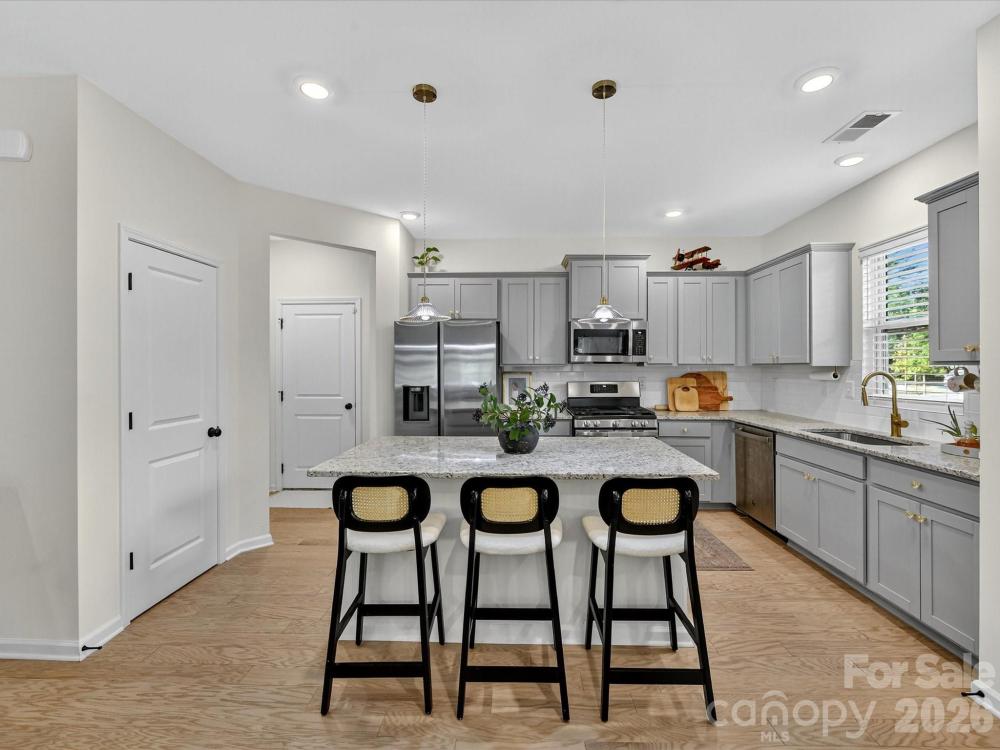 Immaculate 3-bedroom end unit with a rare 2-car garage and thoughtful updates throughout! Built in 2022, this townhome features engineered hardwoods and an open floorplan on the main level, creating a bright and inviting living space. The kitchen showcases shaker style cabinets, a subway tile backsplash, gas range, pantry and a spacious island with at-counter seating that flows seamlessly into the living and breakfast areas. Half bath on main. Upstairs, the primary suite offers a tray ceiling, custom walk-in closet, glass shower, and dual sink vanity. Bedroom 2 also features a custom closet and shares a hall bath with a dual sink vanity. A loft provides versatile additional living space, and the laundry room is conveniently located upstairs. Enjoy a private patio backing up to trees and an unbeatable location near downtown Matthews, Crooked Creek Park, Austin Village Shopping Center, and Sun Valley Commons. HOA amenities include playground. See attachments for the full list of upgrades.