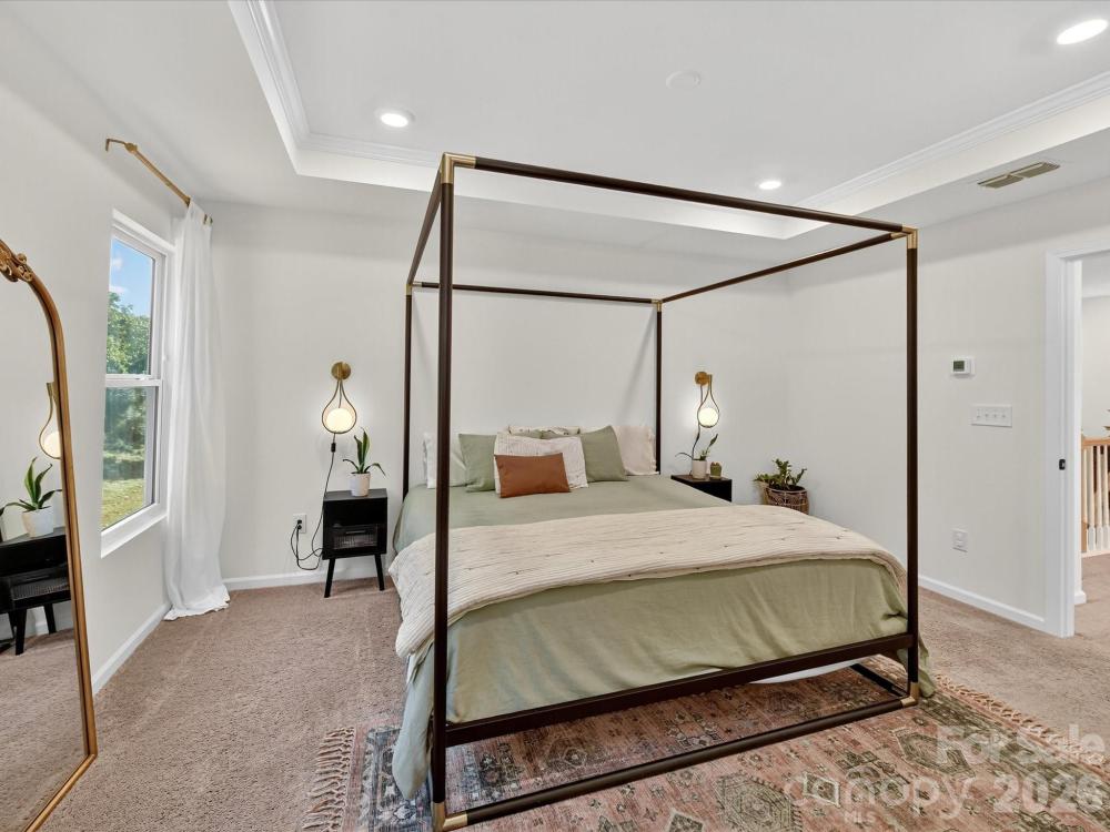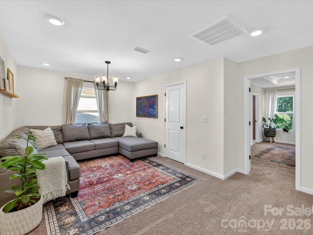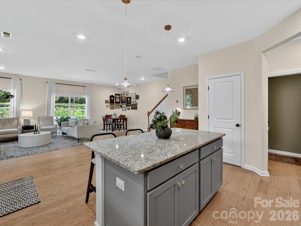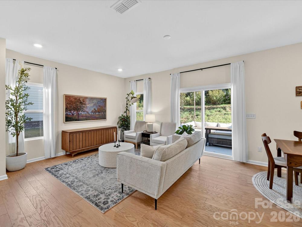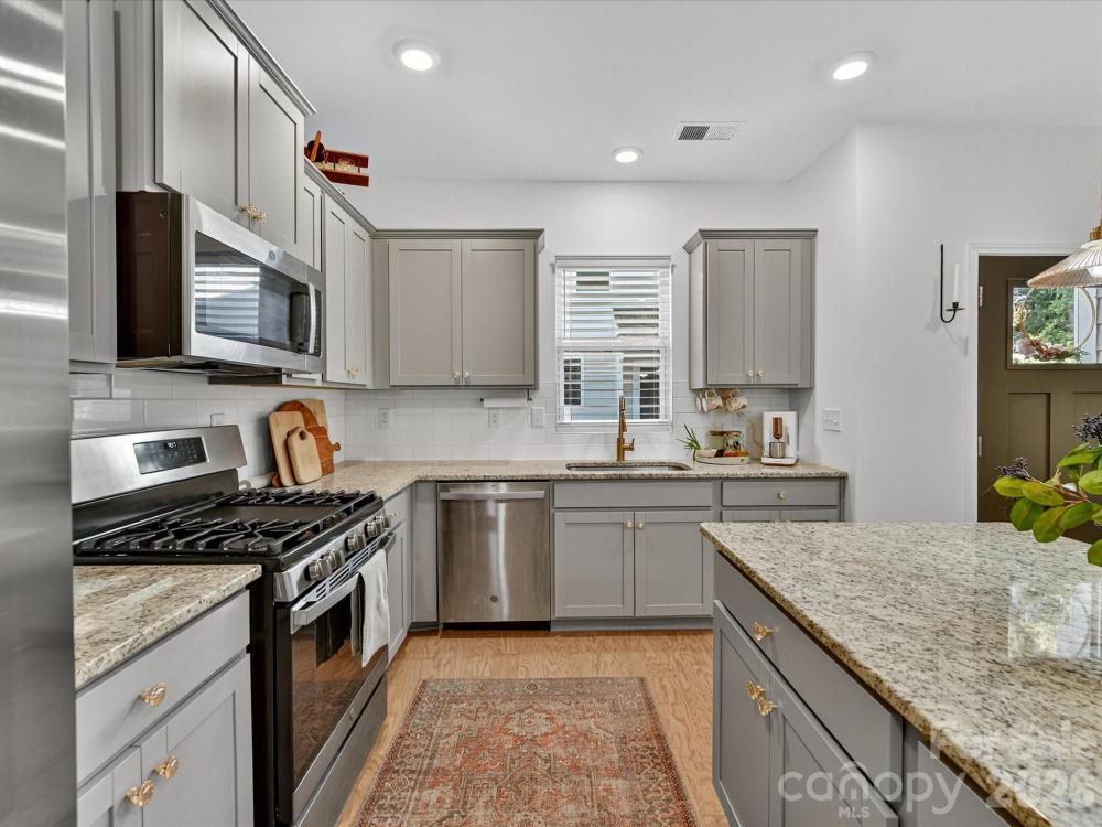 Immaculate 3-bedroom end unit with a rare 2-car garage and thoughtful updates throughout! Built in 2022, this townhome features engineered hardwoods and an open floorplan on the main level, creating a bright and inviting living space. The kitchen showcases shaker style cabinets, a subway tile backsplash, gas range, pantry and a spacious island with at-counter seating that flows seamlessly into the living and breakfast areas. Half bath on main. Upstairs, the primary suite offers a tray ceiling, custom walk-in closet, glass shower, and dual sink vanity. Bedroom 2 also features a custom closet and shares a hall bath with a dual sink vanity. A loft provides versatile additional living space, and the laundry room is conveniently located upstairs. Enjoy a private patio backing up to trees and an unbeatable location near downtown Matthews, Crooked Creek Park, Austin Village Shopping Center, and Sun Valley Commons. HOA amenities include playground. See attachments for the full list of upgrades.