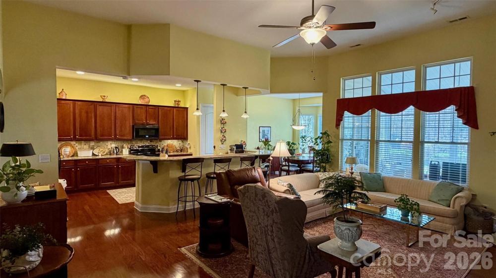 Beautiful home in the welcoming Callonwood Neighborhood with ample space and an ideal layout. Open floor plan with natural light, features a gas fireplace, a breakfast area with a bay window, and a functional kitchen with an extended island. A sliding door leads to a 3-season sunroom (new 2023), patio, and delightful private backyard designed by a master gardener. Three spacious bedrooms, two full baths, and an office on the main level. Full bath and large recreation/bedroom upstairs. Large 2-car garage with shelves and attic storage. Walking distance to ballfield, dog park, playground, clubhouse, and neighborhood pool. Minutes from charming Matthews and convenient commuter routes. Recently renewed Items: Roof, heat/air, microwave, range/oven, dishwasher, EV charger, water filter system, patio, leaf-free gutters, and contractor-built garden shed.