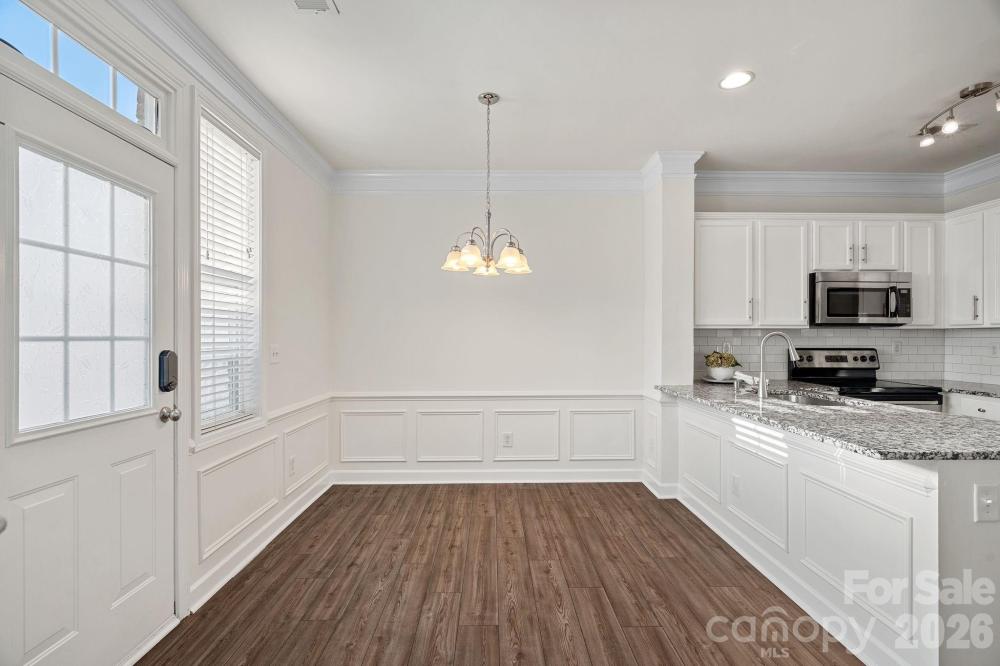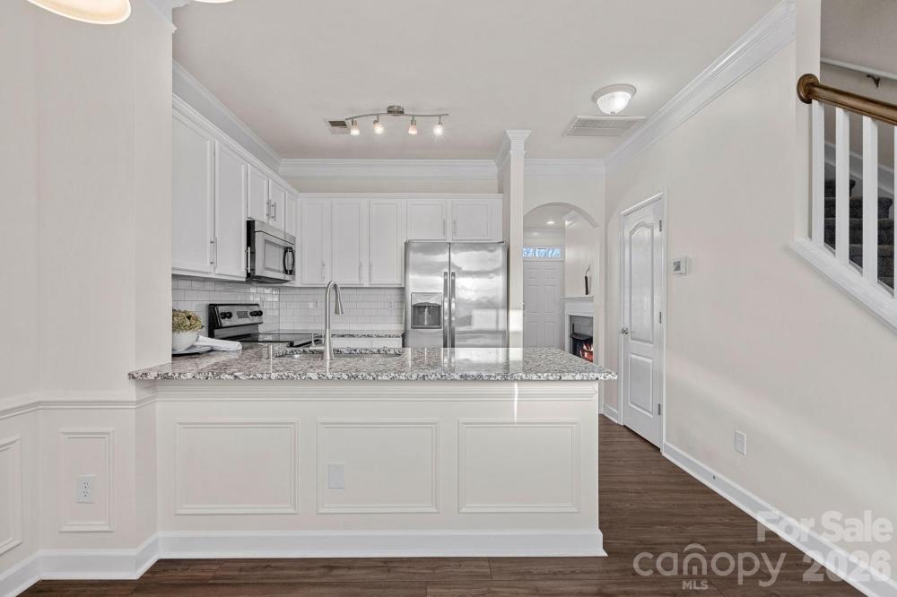 Wonderful 2 BR brick townhome in prime location with modern updates, a private fenced patio, and a detached garage. The main level features a welcoming living room with a fireplace and gas logs, powder room, and a pretty renovated kitchen complete with a breakfast bar, stainless steel appliances, granite countertops, and classic subway tile. Upstairs, both bedrooms have full baths plus a conveniently located laundry closet with washer and dryer to convey. This home is move-in ready and has been meticulously maintained with gentle use. Enjoy low-maintenance living in this very charming community with award winning schools, ideally situated near everything you need. Tree-lined sidewalks provide easy access to recreation areas, dog park, walking trails, popular restaurants, Harris Teeter, and more. A wonderful opportunity not to be missed.