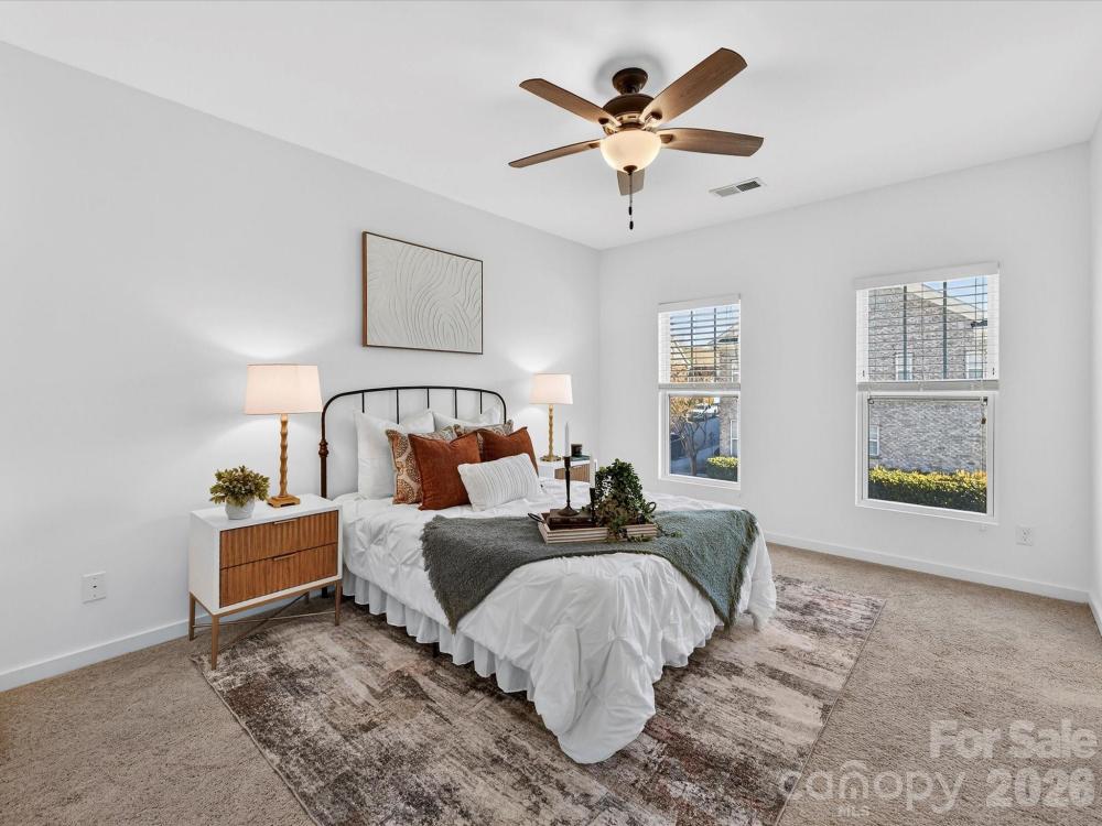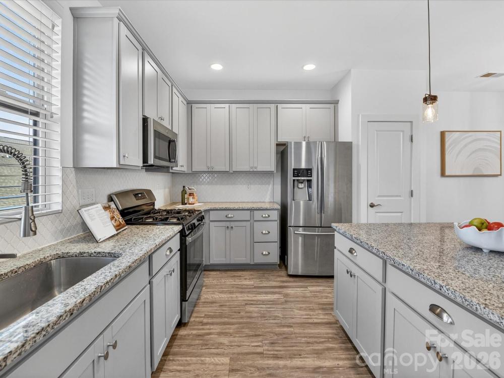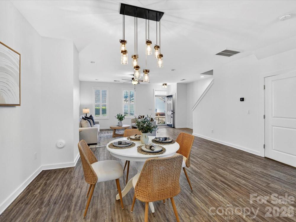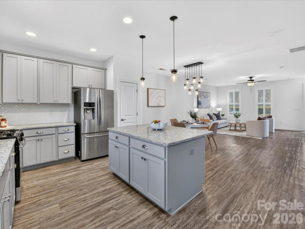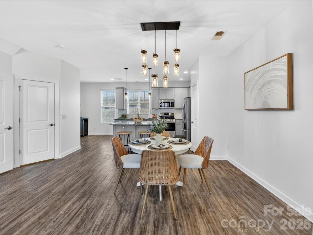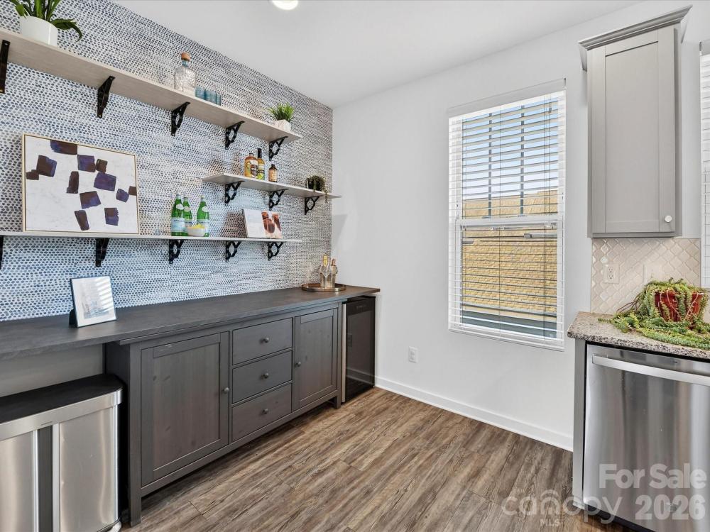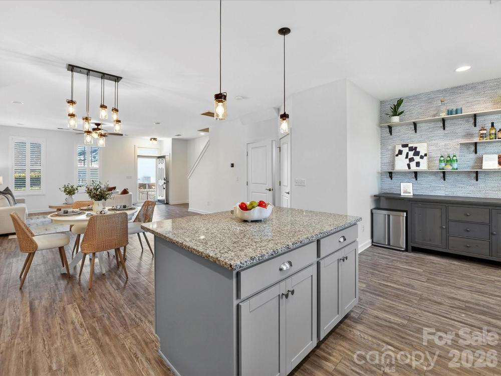 Well-maintained and upgraded two-story basement townhome with a two-car garage, ideally located within walking distance to shopping, restaurants, and entertainment. The main level features luxury vinyl plank flooring and an open, bright floor plan with seamless flow. The fully upgraded kitchen offers granite countertops, stainless steel appliances including refrigerator and wine refrigerator to remain, gas range, large island, tile backsplash, pantry, and abundant cabinetry for storage, connecting to the dining area. All bedrooms are located on the upper level and include ceiling fans. The spacious primary suite features a walk-in closet and private bath with dual vanity, tiled shower with bench seating, and tile flooring. The basement level provides flexible office or recreation space along with direct garage access. Conveniently located near shopping, dining, entertainment, hospital access, and I-77, this townhome offers low-maintenance living in a prime location.