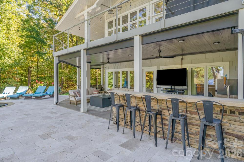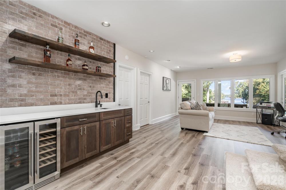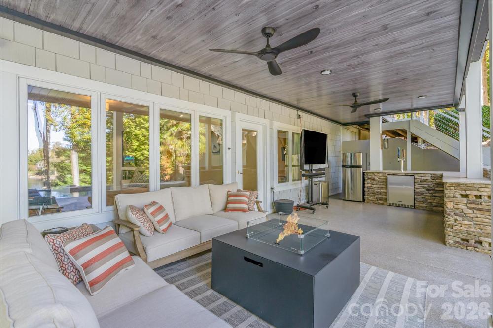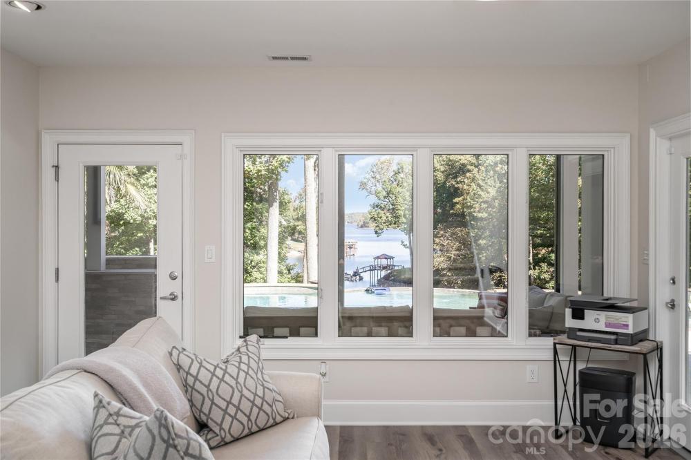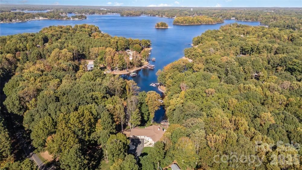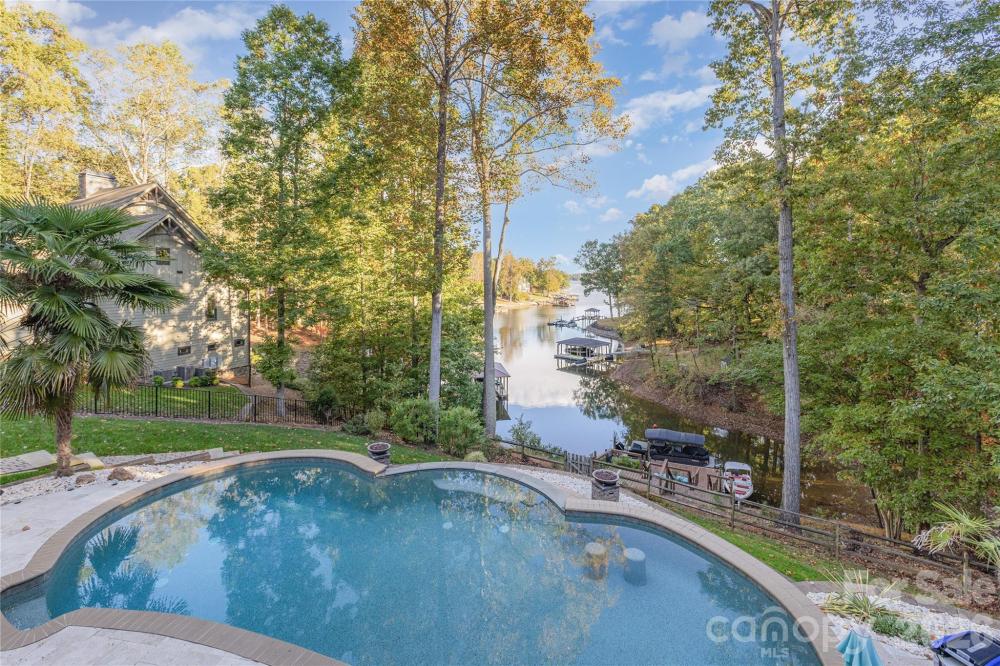 This pristine thoughtfully designed three bedroom plus flex room waterfront retreat offers beautiful year round views from multiple levels, where morning light and sunset reflections become part of everyday living. The main level features an open concept design anchored by a chef’s kitchen with high end appliances and a bonus dedicated beverage refrigerator and freezer, wine refrigerator, and coveted Miele coffee system. The primary suite on the main level is a true sanctuary with a spa like shower, soaking tub, and private balcony access to enjoy those peaceful mornings and glowing sunsets.The lower level offers two additional ensuite bedrooms with spacious walk in closets, a second living area with wet bar, and direct access to the outdoor living space. Outside, a newly converted saltwater infinity pool overlooks the water, complemented by an outdoor kitchen, bar and dining area, creating a private resort atmosphere. Meticulously maintained with many very recent improvements, this home comes with a new septic system, new buried propane tank, new water softener, new gutter guards, new under deck ceiling, updated landscaping, new exterior doors, new lower level luxury vinyl plank flooring, and is freshly painted throughout. Located off Brawley School Road for convenience this beautiful home’s location is the end of a shorter cove for quick main lake access and better dock preservation, all set on a wonderful 1.66 acre lot with no HOA.