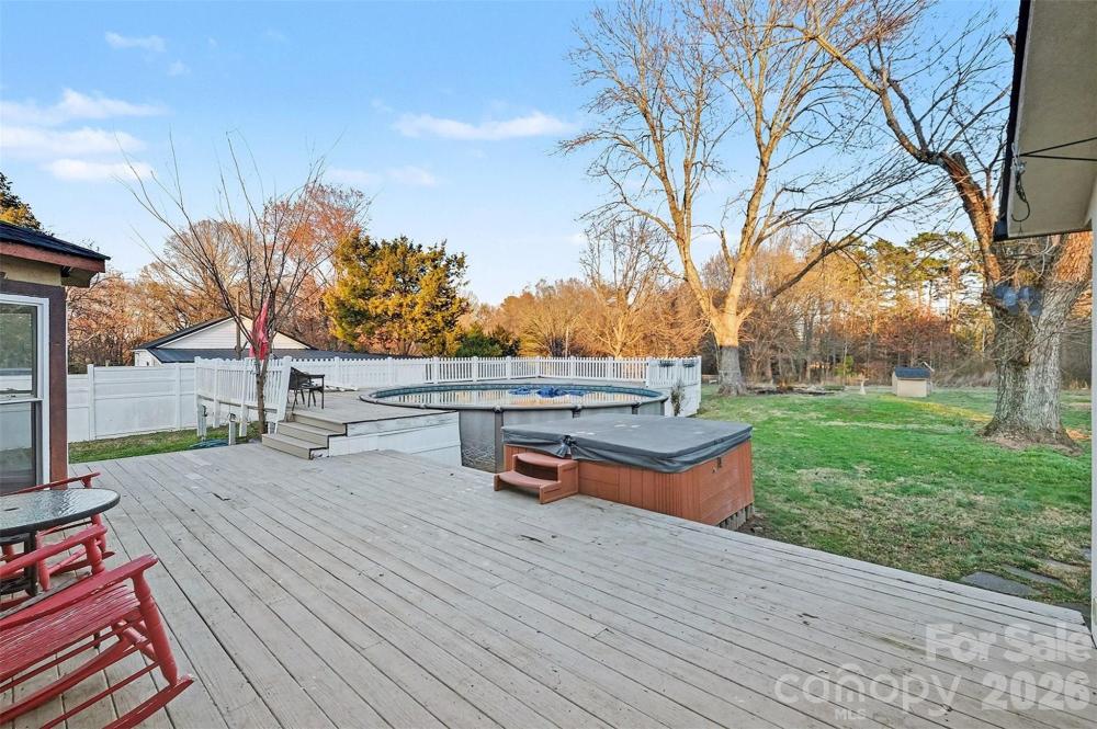 Welcome home to this three-bedroom property situated on a spacious one-acre lot. The outdoor area is designed for both entertaining and relaxation, featuring an above-ground pool with a surrounding deck and a hot tub—perfect for gatherings or a peaceful soak. Step inside to a welcoming living room that flows seamlessly into the dining area. Between the dining room and the kitchen, you’ll find a large butler’s pantry with a closet, offering excellent storage and prep space. The kitchen is equipped with granite countertops, a breakfast bar, a flat-top range and oven, microwave, and a sink positioned beneath a window overlooking the backyard. Pendant lighting and under-cabinet lighting provide both style and functionality. The primary bedroom is large and has dual door closet. The bath has entrance in hall and has shower/tub combination, and single sink. The secodary bath has shower and single sink. The secondary bedrooms are spacious. Additional features include a second garage/shed that can be used for storage, an entertainment area, or hobby space, along with two more storage sheds on the property. The home also boasts a new roof and water heater. The fully fenced backyard offers privacy and plenty of room to enjoy the outdoors.