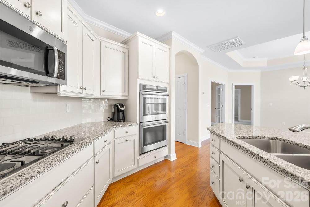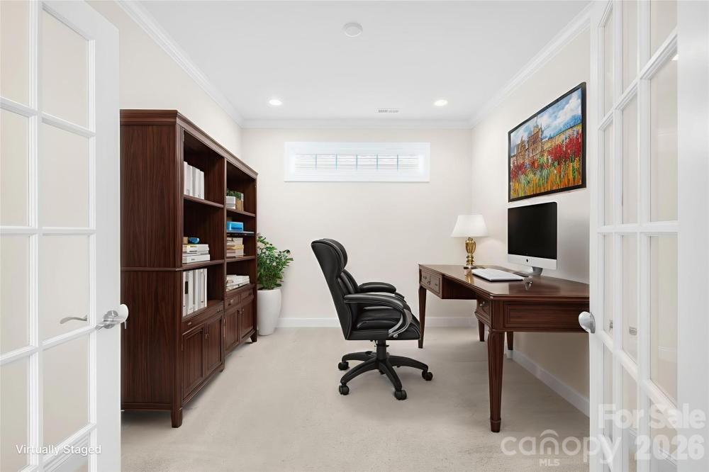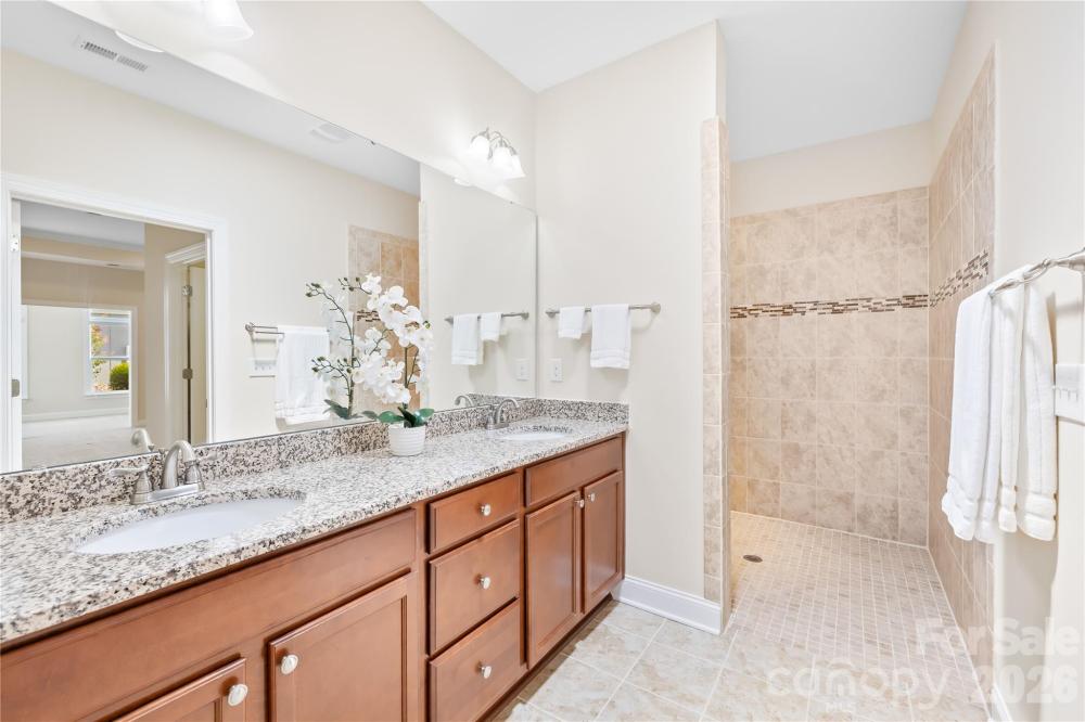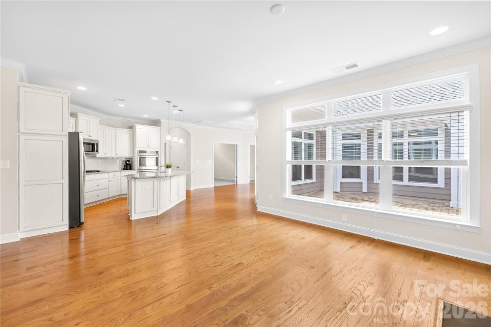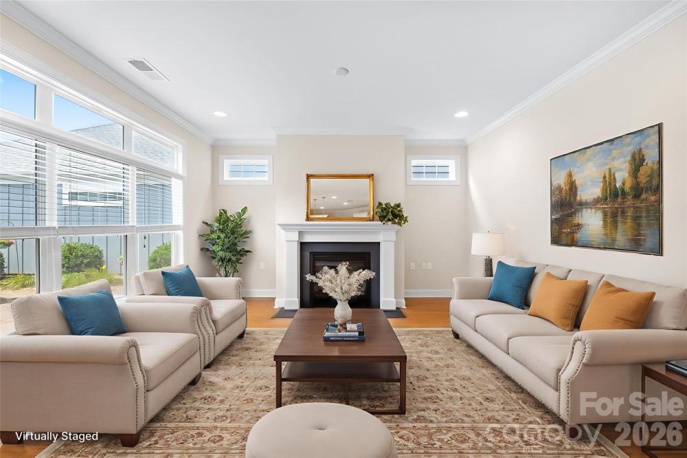 Exceptional value for luxury, low-maintenance living in one of Mooresville's most desirable 55+ communities. This highly upgraded Epcon Portico plan offers 3 bedrooms, 3 full baths, and flexible bonus space ideal for guests, hobbies, or working from home. Hardwood floors flow through the open-concept living and dining areas, anchored by a cozy gas fireplace and a chef's kitchen featuring a large island, granite countertops, soft-close cabinetry, a gas cooktop, and double wall ovens. French doors open to a private office, while the primary suite includes a sitting area, walk-in closet, and spa-style bath with roll-in tile shower. Upstairs offers a spacious bonus room, third bedroom, and full bath - perfect for visitors. Enjoy outdoor living in your private brick-paver courtyard or relax on the covered front porch surrounded by beautifully maintained landscaping. Built-in cabinets and ample shelves line the oversized two-car garage, providing plentiful storage space. HOA includes lawn and major exterior maintenance plus Spectrum cable and internet, along with resort-style amenities including clubhouse, pool, fitness center, walking trails, and sidewalks - all minutes from Lake Norman, dining, shopping, and medical care. A rare opportunity for an easy, lock-and-leave lifestyle. Please note new carpet in primary and office Jan 2026 after photos.
