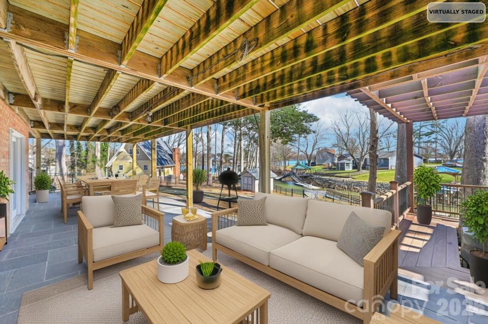 Welcome to this meticulously maintained waterfront retreat. Tucked away on a peaceful cul-de-sac with no HOA restrictions, this home combines privacy with convenience. Just bring your boat and start enjoying everything this home has to offer. Boasting over 150 feet of shoreline, relax on the newly installed stone patio,deck or soak in the hot tub after a day in the sun. Enjoy effortless lake access from your private dock, complete with a newer High Tide 9,000-pound remote-controlled boat lift (2021). The fenced backyard provides a secure space for recreation and includes a storage shed for all your lake essentials. Inside, the move-in ready home features a welcoming great room accented by crown molding and a striking stacked-stone feature wall. The kitchen captures beautiful lake views through new sliding glass doors that lead to an expansive wraparound deck. Highlights include abundant natural light, granite countertops, tile backsplash, tile flooring, and updated appliances such as a newer refrigerator and dishwasher. The dining area adds character with shiplap walls, a designer chandelier, and direct deck access. The lower level offers a spacious recreation room with a built-in bar - ideal for hosting gatherings after a day on the water. The primary suite is also located downstairs and features a renovated bathroom with a large walk-in spa-style shower. A wood-burning fireplace with stove insert and blower efficiently heats the entire home during cooler months, and the chimney has been recently updated. Other recent upgrades include a new water heater, gutters, hot tub, refrigerator and dishwasher. Newer HVAC system (2023), whole-home water filtration system (2021). Ideally situated both on and off the lake, the home is just minutes from dining, shopping, marinas, waterfront restaurants, schools, I-77, and more - offering the perfect blend of relaxation and accessibility.