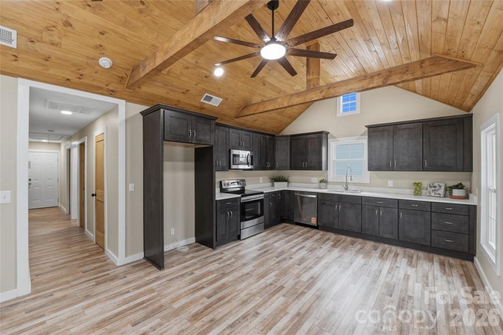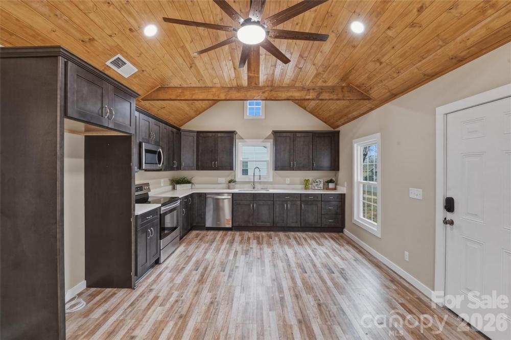 If you are looking for a truly treasured, remodeled home within walking distance to downtown Mooresville, this is it! The seller has reconstructed this home almost completely! The front of the home shows off the new hard board siding and covered front porch. Walk into the showstopper, gorgeous living space with its unique shiplap cathedral ceiling highlighted by one-of-a-kind rough cut aged pine beams. Finish it off with large, dual modern ceiling fans and recessed lighting for the perfect blend of rustic and modern design. All brand new, insulated, double hung windows are carefully placed to maximize natural light throughout the home. Kitchen features brand new shaker cabinetry with soft close drawers and doors, quartz countertops, large under mount stainless steel sink nestled perfectly under the window, all new stainless steel appliances. Recessed lighting throughout the home and ample crown molding. Primary bedroom suite has large, dual closets, ceiling fan and gorgeous tiled shower/tub combo. Secondary bedrooms have ceiling fans and large closets. Brand new 10X20 modern deck with vinyl decking and railing finished off with modern cable railing. What the seller did that you can't see is just as impressive. Beneath the beautiful, scratch resistant wood laminate floors throughout the home is all new load beams, subfloor & floor joists, and internal foundation has all new footers & supports. All systems are brand new! Heat pump, duct work, electrical, plumbing, water heater. New roof w/new sheathing & 30 year architectural shingles. The attic is a completed conditioned space to within 10 degrees of the home with spray foam insulation designed to keep energy costs low and provides storage space. The crawl space is completely encapsulated along with a new dehumidifier and pump. With its smaller lot size, outdoor maintenance is virtually non-existent. This home is practically maintenance free without having to pay a monthly HOA fee. It is truly one of a kind! Move in, just relax and enjoy!