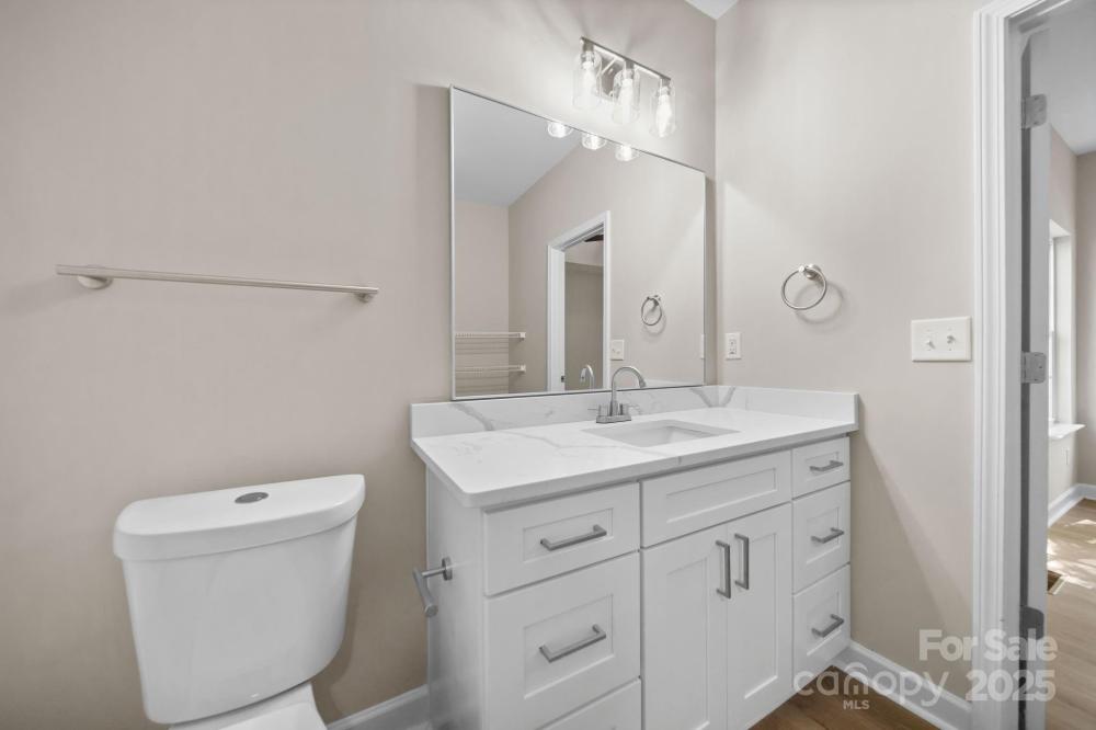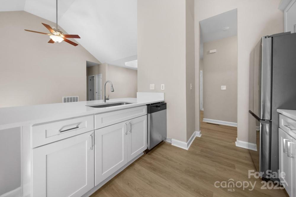 Discover this beautifully updated 3-bedroom, 2-bath ranch on a spacious 1.17-acre lot in desirable Troutman. With 1,424 sq. ft. of stylish living space, this home offers an open floor plan with vaulted ceilings—perfect for entertaining family and friends. The split-bedroom layout provides privacy, while the fully renovated kitchen features new cabinetry, stainless steel appliances, modern lighting, and sleek quartz countertops. Both bathrooms have been updated with new cabinets, lighting and quartz vanities. Luxury vinyl plank flooring adds warmth, durability, and contemporary appeal throughout the home. Brand new roof and HVAC mean this should be low maintenance for years. Step outside to a large deck overlooking a peaceful, private backyard—ideal for relaxing or hosting gatherings. Enjoy the freedom of no HOA fees and the convenience of being close to shopping, Lake Norman State Park, and I-77. Move-in ready and beautifully finished, this home perfectly blends comfort, style, and location. Some Photos virtually staged.